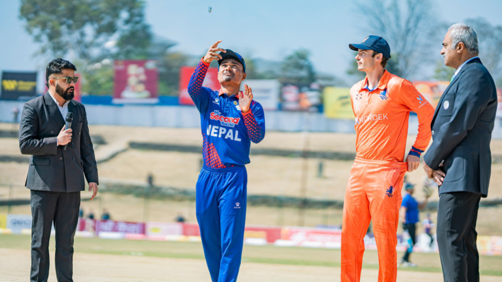 नेपालले ट्वान्टी २० अन्तर्राष्ट्रिय त्रिकोणात्मक शृंखलामादरल्यान्ड्सविरुद्ध पहिला फिल्डिङ गर्ने भएको छ । नेपालका कप्तान रोहित पौडेलले बुधबार टस जितेपछि त्रिवि क्रिकेट मैदान कीर्तिपुरमा नेदरल्यान्ड्सलाई ब्याटिङका लागि बोलाएको हो ।नामिबियाविरुद्ध मंगलबार २० रनले पराजित भएको खेलबाट नेपालले दुई खेलाडी परिवर्तन गरेको छ । नेपाली टोलीमा ललित राजवंशी र प्रतिश जिसी समावेश गरिएको छ । उनीहरूलाई अविनाश बोहरा र विवेक यादवको स्थानमा ल्याइएको छ ।नेपाली टोलीको प्लेयिङ ११ मा कुशल भुर्तेल, आसिफ शेख, रोहित पौडेल, कुशल मल्ल, दीपेन्द्रसिंह ऐरी, सन्दीप जोरा, गुलशन झा, करण केसी, सोमपाल कामी, प्रतिश जिसी र ललित राजवंशी छन् ।स्कट इडवार्डसको कप्तानीमा रहेको नेदरल्यान्ड्सले क्रिकेट विश्वकप लिग २ को टोलीबाट फ्रेड क्लासेन र टीम भान डेर गुटेनलाई राखेको छ । भान डेर गुट प्लेयिङ ११ बाट खेलिरहेका छन् ।अलराउन्डर बास डी लेड इंग्लिस काउन्टी क्रिकेट खेल्न फर्किसकेका छन् । उनी डरहमबाट खेलिरहेका छन् । डरहममा नेदरल्यान्ड्सका पूर्वप्रशिक्षक रायन क्याम्बेल प्रशिक्षक रहेका छन् ।डच क्रिकेट टोलीको ब्याटिङ प्रशिक्षकमा दक्षिण अफ्रिकाका ग्यारी क्रिस्टेन समावेश भएका छन् । भारतलाई २०११ को विश्वकपको उपाधि दिलाउँदाका प्रशिक्षक क्रिस्टेन तीन दिन अघि नेपाल आएका थिए । उनी जुनमा वेस्ट इन्डिज र अमेरिकामा हुनेश्वकपसम्मका लागि नेदरल्यान्ड्सको ब्याटिङ परामर्शको रुपमा रहेका छन् ।दक्षिण अफ्रिकाको केपटाउनमा १ महिना महिना प्रशिक्षण गरेर नेपाल लिग २ र ट्वान्टी २० अन्तर्राष्ट्रिय त्रिकोणात्मक शृंखलाका लागि तयारी गरेको थियो । क्रिस्टेन केपटाउनमा नेदरल्यान्ड्सको तयारीमा पनि रहेका थिए ।दक्षिण अफ्रिकाका पूर्व ओपनिङ ब्याटर क्रिस्टेन यसअघि पनि नेदरल्यान्ड्सको ब्याटिङ प्रशिक्षकको रुपमा रहेका थिए ।