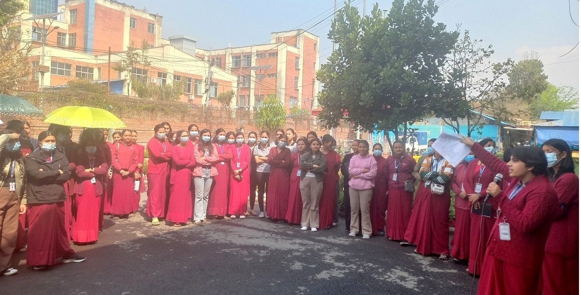 आफूहरूले पढ्दै आएको सङ्काय नै परिवर्तन गरिएको भन्दै महाराजगञ्ज नर्सिङ क्याम्पसका विद्यार्थी आन्दोलित बनेका छन् । चिकित्सा शिक्षा आयोगले लिएको एकीकृत प्रवेश परीक्षा (कमन इन्ट्रान्स इक्जाम) बाट पास भएर बीएमएस (ब्याचलर मिडवाइफ्री साइन्स) पढ्न आएका विद्यार्थीहरू आफ्नो सङ्काय नै परिवर्तन गरिएको भन्दै आन्दोलनमा उत्रिएका हुन् ।एउटा कार्यक्रमका लागि भनेर भर्ना लिइएको तर, अर्को कार्यक्रमको पढाइ भइरहेको, पाठ्यक्रम समेत अर्को विषयमा रहेको भन्दै विद्यार्थीहरूले क्याम्पसमा तालाबन्दी गर्नुका साथै फागुन २० गतेदेखि आन्दोलन थालेका हुन् । उनीहरूले एकेडेमिक र क्लिनिकल गतिविधिसमेत बन्द गरेका छन् ।क्याम्पस प्रशासन, चिकित्साशास्त्र अध्ययन संस्थान (आईओएम) डीनको कार्यालय लगायतका सरोकारवाला निकायसँग पटकपटक छलफल गर्दा पनि समस्या समाधान नभएको विद्यार्थीहरूको गुनासो छ ।चिकित्सा शिक्षा आयोगले एकीकृत प्रवेश परीक्षाका लागि सूचना प्रकाशन गर्दा बीएमएस, बीएससी मिडवाइफ्रीबारे केही उल्लेख थिएन । आयोगले नै नलिएको विषयमा आईओएमले चार वर्षे बीएमएस कार्यक्रमका लागि भर्ना लियो । गत जेठ २७ मा महाराजगञ्ज नर्सिङ क्याम्पसको भर्ना सूचनामा समेत बीएमएस उल्लेख थियो ।क्याम्पसले २०८० जेठ ३२ मा ओरेन्टेशन कार्यक्रम राखेको थियो । उक्त कार्यक्रममा राखिएको ब्यानरमा पनि ‘बीएमएस’ नै उल्लेख थियो । विद्यार्थीहरूसँग गरिएको कबुलियतनामा पत्रमा समेत ‘बीएमएस’ नै थियो ।साउन ५ बाट पढाइ सुरू भयो र बीएमस भनेरै पढाइयो । मंसिर ४ सम्म बीएमएस कार्यक्रम भनेरै ‘क्लिनिकल ड्युटी रोस्टर’ समेत बनेको थियो । तर, अचानक मंसिर २२ मा बीएमएस कार्यक्रमलाई बीएससी मिडवाइफ्री भनेर परिवर्तन गरियो ।आफूले पढिरहेको विषयको पाठ्यक्रमबारे विद्यार्थीहरूले बारम्बार प्रश्न उठाउँदै आए पनि कतैबाट चित्तबुझ्दो जवाफ आउन सकेको थिएन । दोस्रो सेमेस्टरमा अध्ययनरत निरमाया गुरुङका अनुसार सुरूमा बीएमएस भनेर भर्ना भएको तर, अहिले कुन विषय हो भन्ने नै यकिन छैन ।‘हामी सुरूमा बीएमएस भनेर इनरोल भयौँ । कलेजमा ओरेन्टेशन क्लासमा पनि त्यही भनियो । पढ्दै गर्दा पछिमात्रै हामीले पढिरहेको कोर्ष ४ वर्षे रहेछ भनेर थाहा भयो,’ गुरुङले भनिन् ।चार वर्षे भने पनि विद्यार्थीहरूले स्वीकार गरेर पढिरहेका थिए । त्यही बेला कलेजबाट कोर्ष डिजाइन नै परिवर्तन भएर आयो । कलेजले बीएससी मिडवाइफ्री भनेर सबै कागजातमा उल्लेख गरिदियो । त्यसपछि विद्यार्थीहरूले विरोध जनाए ।क्याम्पस प्रमुख तथा अध्यापकहरूसँग कुरा गर्दा आफूहरूलाई ‘अहिले पढ्दै गर्नु । पछि हामी माथिल्लो निकायमा यो कुरा राखिदिन्छौँ । बीएससी मिडवाइफ्री पढ्दा समस्या नहोला’ भन्दै टार्न 