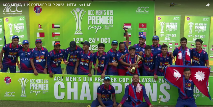 सिरहा, कार्तिक ७ गते । एसीसी यु–१९ एकदिवसिय प्रिमियर कपको उपाधी नेपालले जितेको छ । मलेसियाको वायुमास खेल मैदानमा आज युएईलाई २० रन अन्तरले पराजित गर्दै उपाधी जितेको छ ।